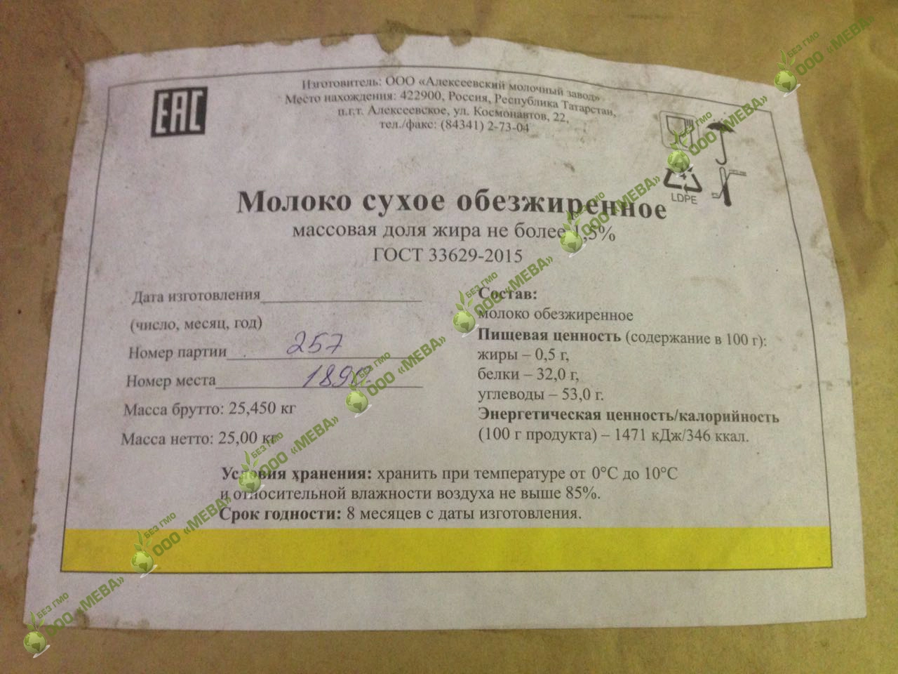 Молоко сухое обезжиренное, СТРОГО ГОСТ 33629-2015, жирность не более 1.5%, крафт-мешок 25 кг, напрямую с Алексеевского МКК. Республика Татарстан. (не перекупы, цены прямые с завода)